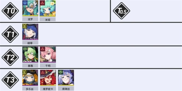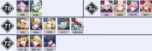 3、辅助类角色:T0:梨梨、克洛斯。T0.5:黛纳、芙蕾雅、幻音千明、彼安汀。T1:多琪、马维尔、月夜见、RC-77、寻愿多乐丝。T2:风见一宵、酣梦一宵、克拉肯。