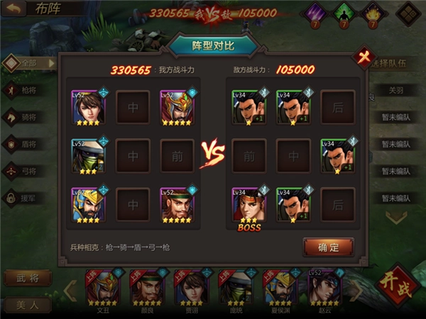 首先观察敌军布阵,在布阵上我们可以看出关卡BOSS是一个三星盾将,而前排是3个枪将,所以这次布阵以弓为主,以骑为辅。