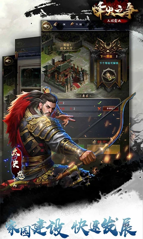 3、全新的战斗玩法,3D画质,重现三国历史,合体搭配兵种,轻松统一三国,征战各路诸侯,最终统一三国,成就你的霸业