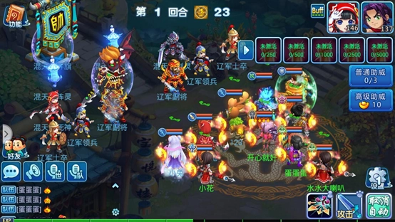 没错,这个玩法有观战系统,实力不足的玩家们可以选择观战,然后给出战的队伍助威。助威次数达到一定程度,可以触发增伤buff,最多为增伤200%。可以看到上图右上角的指令,破阵脚时,其他人可以给予5次普通助威(无消耗)和3次高级助威(10元宝/次)。助威本身不仅能获得战斗参与奖励,还能额外获得助威奖励。相应的,上场的队伍除了战斗参与奖励外,可以获得击杀阵脚的高级奖励。