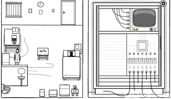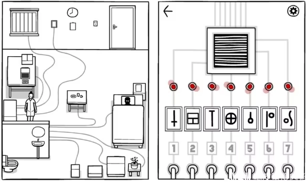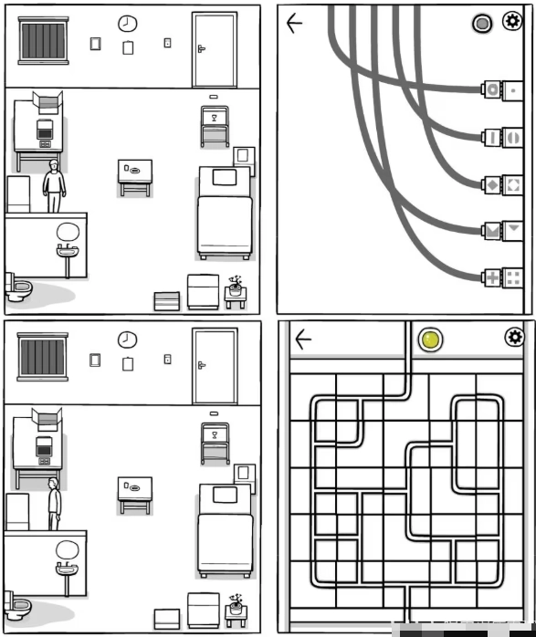 4、这些线需要连接到各个物品上,去找到每根线对应的符号(床上那根是没有的,连接的是小黑的记忆),注意,窗户上点击小鸟出现符号,早餐桌喝掉饮料出现符号。具体截图见下。看电视,转动频道,依次看到:甜甜圈、箱子、花盆、劳拉的照片、音箱、硬币、鸟。按照这些信息,排列刚刚的符号,开启下面的柜门,连通记忆。开启密码见下图。