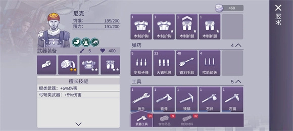 3、玩家需要关注自己的饥饱、伤痛等生存状态,受伤了需要包扎,饿了要吃饭,这些都考验着玩家的生存策略。
