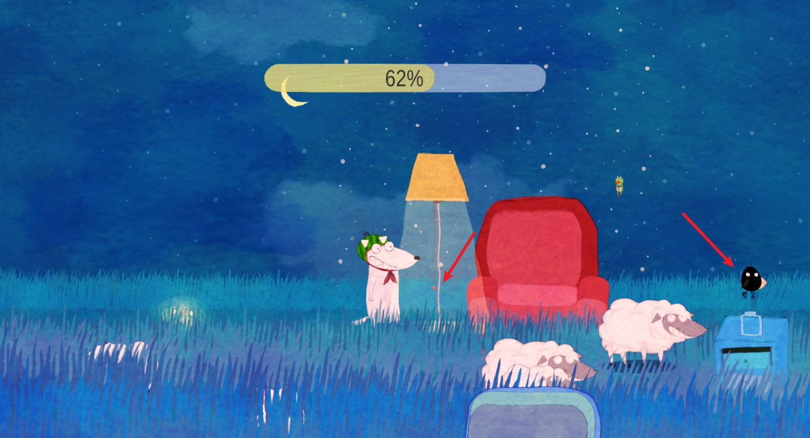 6、接着按下灯罩下方的开关,就能切换到夜晚场景,如此一来,停在瓶子上的乌鸦便会飞走。