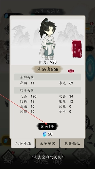 2、在修炼界面中,可见角色当前修为练体期一层,点击闭关1年选项,消耗对应宝石来提升角色的修为等属性。