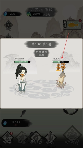 3、进入第1章第1关的战斗关卡,与对手鱿鱼王对战,需在剩余时间内击败它以推进关卡进度。