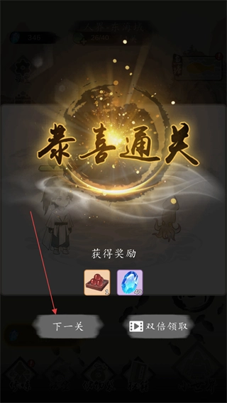 4、通关后出现恭喜通关的提示界面,点击下一关按钮可继续挑战,同时能获取对应的通关奖励。