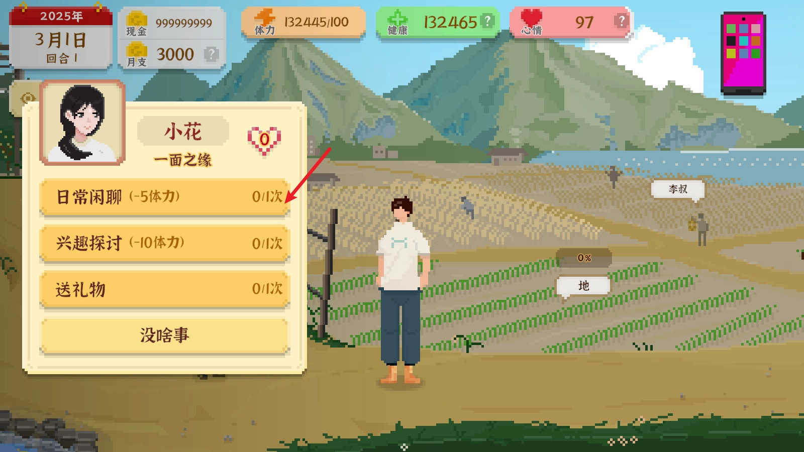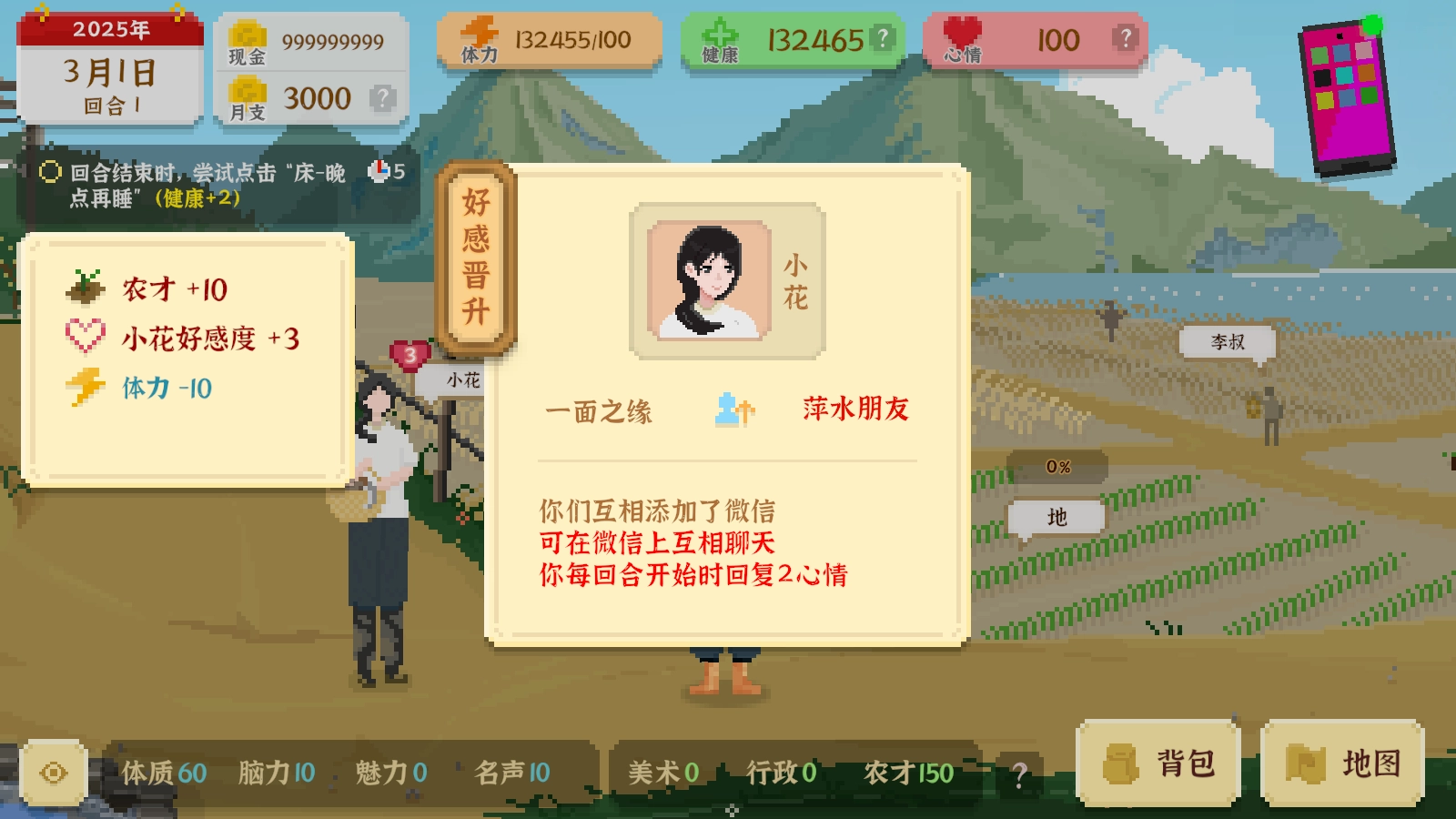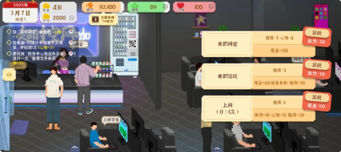 3、网咖:可以去网咖花费50上网一次,可以获得10体力、15心情和20的脑力,但是会损耗2健康。