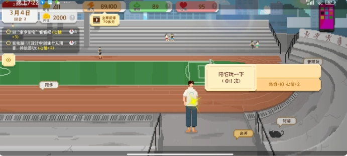 4、撸猫:前往体育场找到阿喵,对话即可获得10体力。