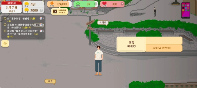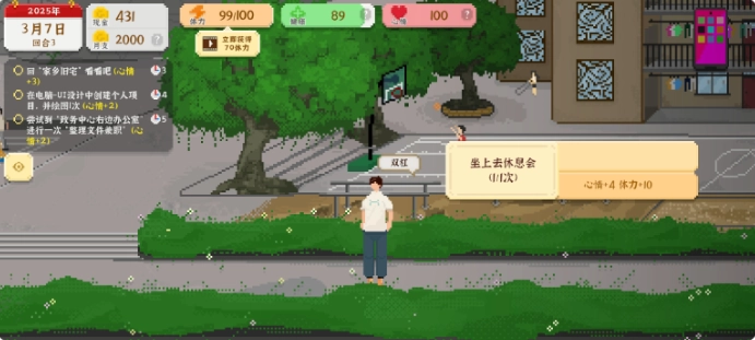 6、高级中学:在高级中学内有两个恢复体力的地方,一个是右侧的休闲椅,通过交互后可以恢复10体力和4心情;另外一个是左边的双杠,交互后有概率获得10体力。
