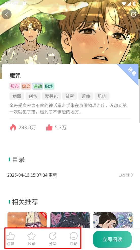 4、一键点击进入漫画详情页,支持收藏、评论、分享等。