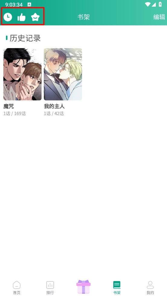 7、最后在"书架"页面可以查看历史阅读记录和收藏、点赞的漫画。