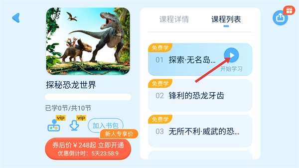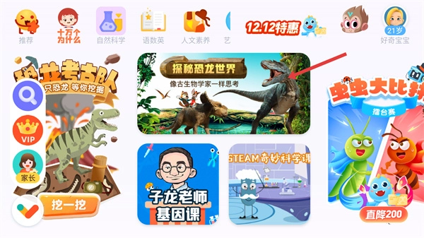 1、在应用首页的展示区域里找到【探秘恐龙世界】的课程卡片,点击这张卡片后,就能进入对应的课程详情页面查看相关信息。