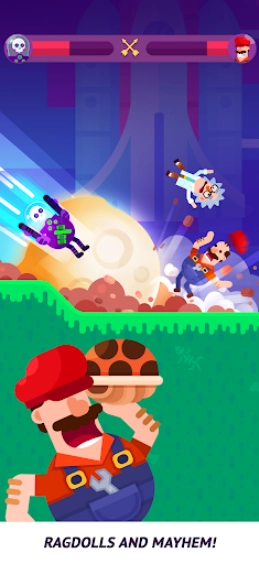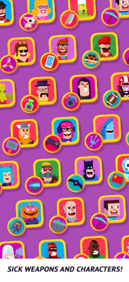 游戏中,我们需要通过拖动屏幕来控制角色投掷的角度和力度,瞄准好敌人进行射击,利用角色独特的武器去击中对手,造成不俗的伤害!不断的去消灭对手来赢下比赛,获得丰富的奖励,解锁更多有意思的角色和模式,体验更加丰富的内容!