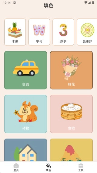 3、填色页面包含水果、字母、数字、曼茶罗、交通、鲜花等多种类别。