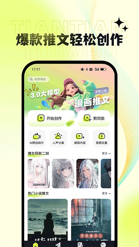 天天推文是一款面向内容创作者与营销人员的小说推文创作工具,旨在简化小说推文及短视频的创作流程。它以“让创作更简单高效”为核心,拥有海量覆盖情感、职场、科技等全领域的热门素材库,每日实时更新热门视频、经典漫画片段和爆款小说素材,用户能自由组合创新,打造出差异化的推文作品。 这款工具还具备AI智能生成文案功能,可根据关键词自动生成吸睛的标题与正文,显著提升创作效率。此外,它支持多平台一键发布,并通过智能推荐算法精准匹配用户兴趣,帮助创作者高效触达目标受众。无论你是零基础新手还是资深达人,都能通过简洁操作产出爆款内容并实现变现,有需要的用户可在本站免费使用。