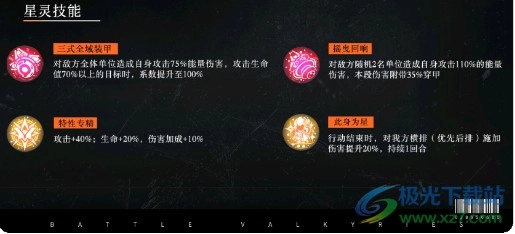 三式全域装甲:对敌方全体单位造成相当于自身攻击75%的能量伤害;若攻击目标的生命值处于70%及以上状态,该伤害系数将提升至100%。