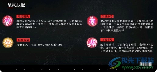 终焉裁决:对敌方纵列目标造成相当于自身攻击力150%的物理伤害,同时对每个目标各有80%的概率附加恐惧效果,此外必定会使目标中攻击最高的1名角色进入沉默状态。