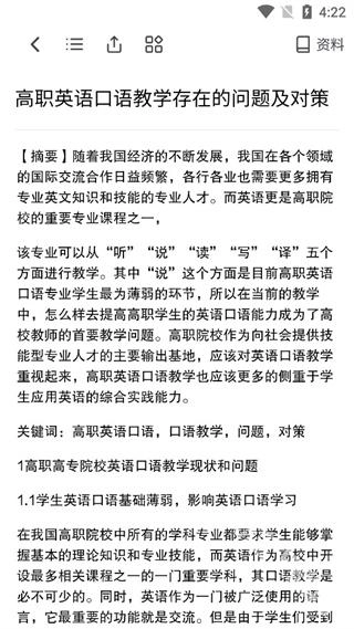 4、进入写作页面后,用户能够点选右上角的“资料”功能查阅相关资料。
