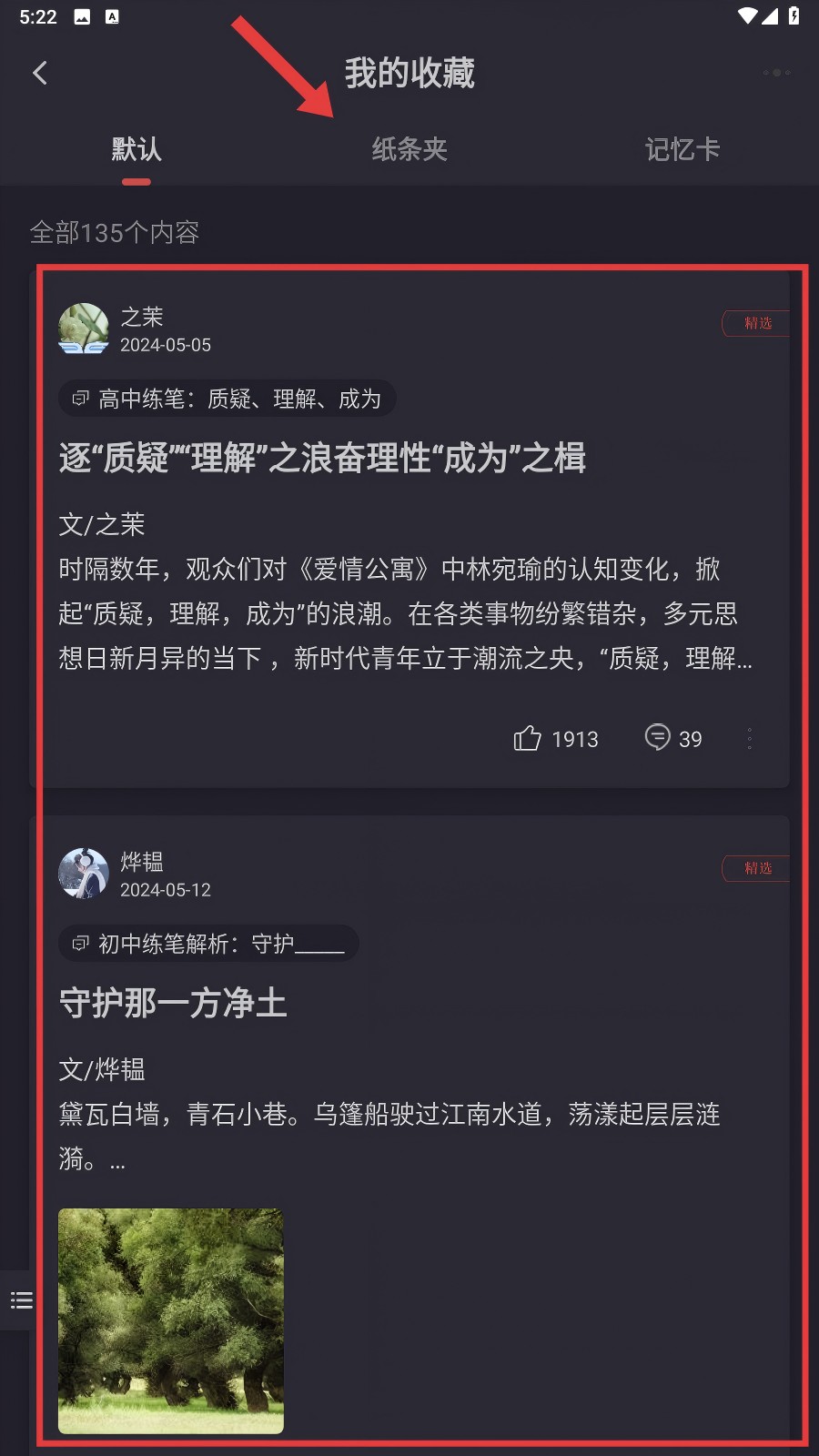 3、进入【我的收藏】页面,默认能看到收藏的各类文章,若想找分类整理的内容,就点【纸条夹】吧。