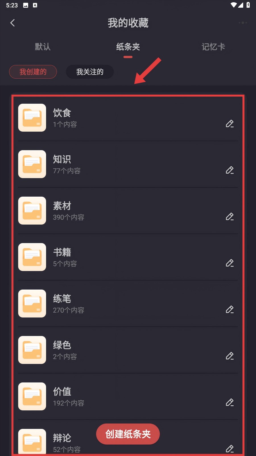 4、切换到【纸条夹】,能看到各类文件夹,还能点击【创建纸条夹】,自己整理收藏内容超方便的。