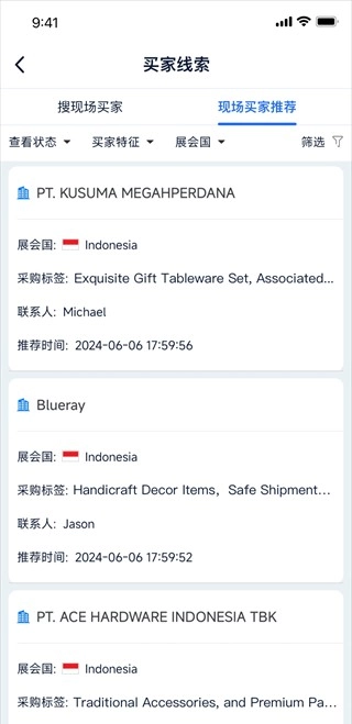 新增展会现场智能买家推荐功能,高效匹配到场买家的同时,智能算法将推荐更多潜在买家。