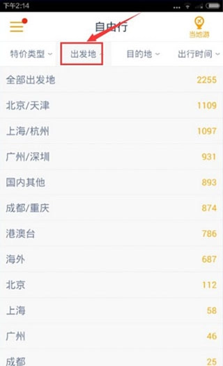 3、点击出发地,即可了解所有选择出发地的特价信息,用户可以根据自己选择的出发地来选择旅游线路哦。