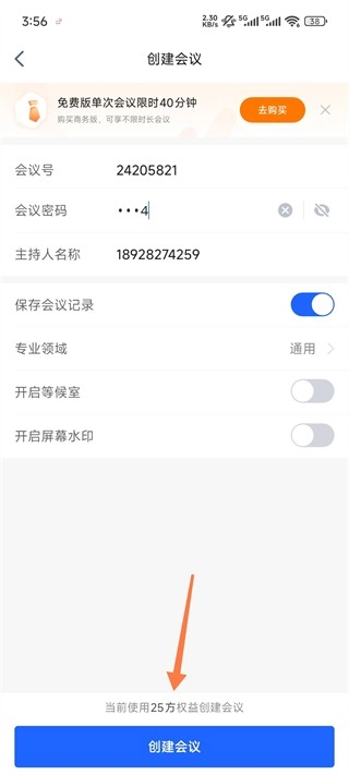 2、创建会议页面,输入会议密码、主持人名称等,点击创建;