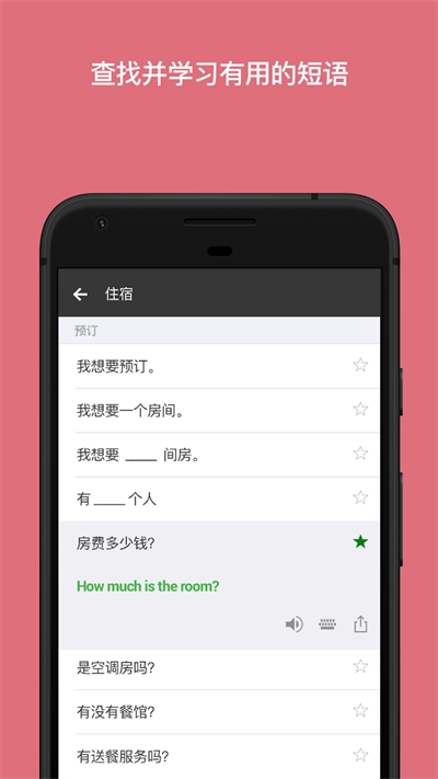 5、收录了多种出国旅游场景的常用语手册与发音指引,帮助您在旅途中学习外语。
