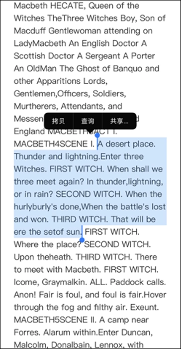 4、除了通过截图后拍照的方式进行翻译外,iOS用户还能在手机浏览器里长按选中想要翻译的句子。