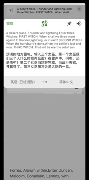5、随后点击“共享”按钮,在下方的软件列表里找到“翻译”并点击,此时会自动弹出翻译界面。接着我们选择好需要翻译的目标语言,系统便会自动生成双语对照的翻译结果。