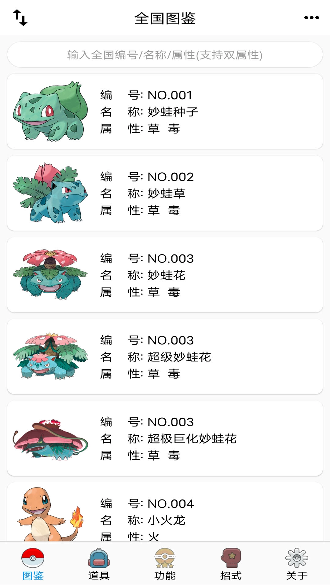 1、全国宝可梦图鉴:涵盖了宝可梦的基础信息,不过进化链与招式系统仍处于优化完善阶段。