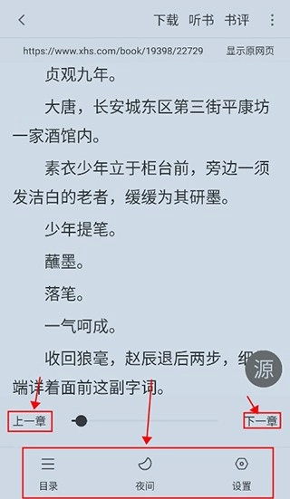 进入阅读界面之后,用户等待内容加载完毕,点击下方可以调节章节,还可以选择目录以及进入夜间白天模式的调节。