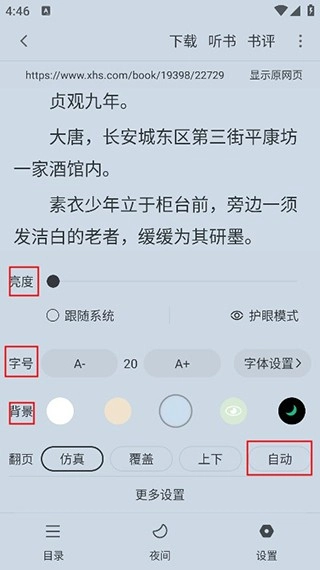 用户还可以点击右下角的设置,可以设置亮度、字体的等,还可以点击右下角的自动进行自动阅读,非常方便。