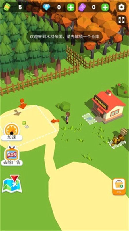 进入小小木材商游戏后,通过虚拟键盘操控角色移动,点击方框内的钞票即可解锁一个仓库。