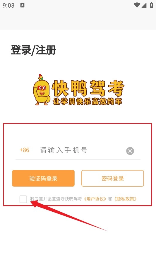 1、快鸭驾考,然后进入软件首页,首次使用需要用户注册并登录才能使用。