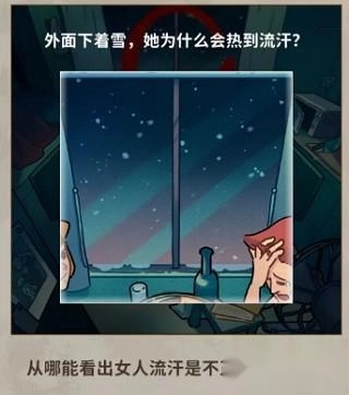 答案:点击前面的窗帘,然后会打开,可以看到外面正在下雪,这么冷的天气在流汗不正常。