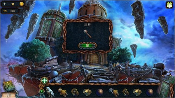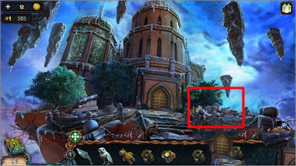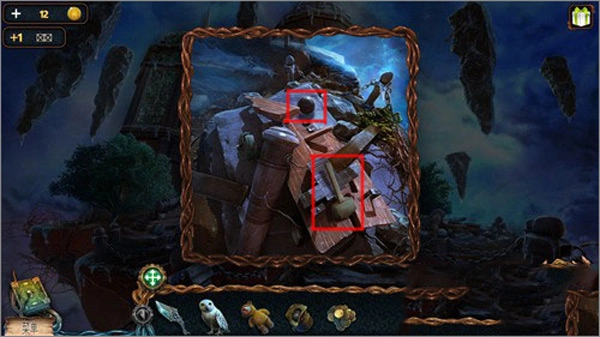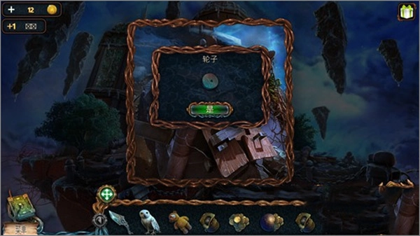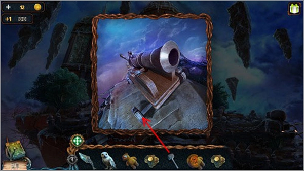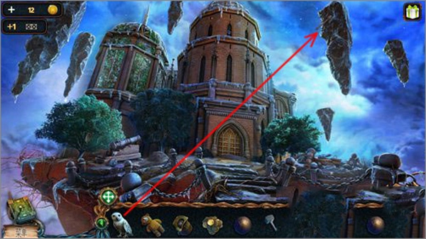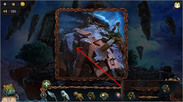 5、先点击猫头鹰,接着点击右上角悬浮的石头,猫头鹰就会飞上去把推杆取下来。