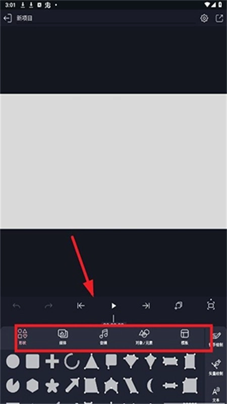 4、可依据需求选择形状、媒体、音频、对象、元素或模板进行导入。