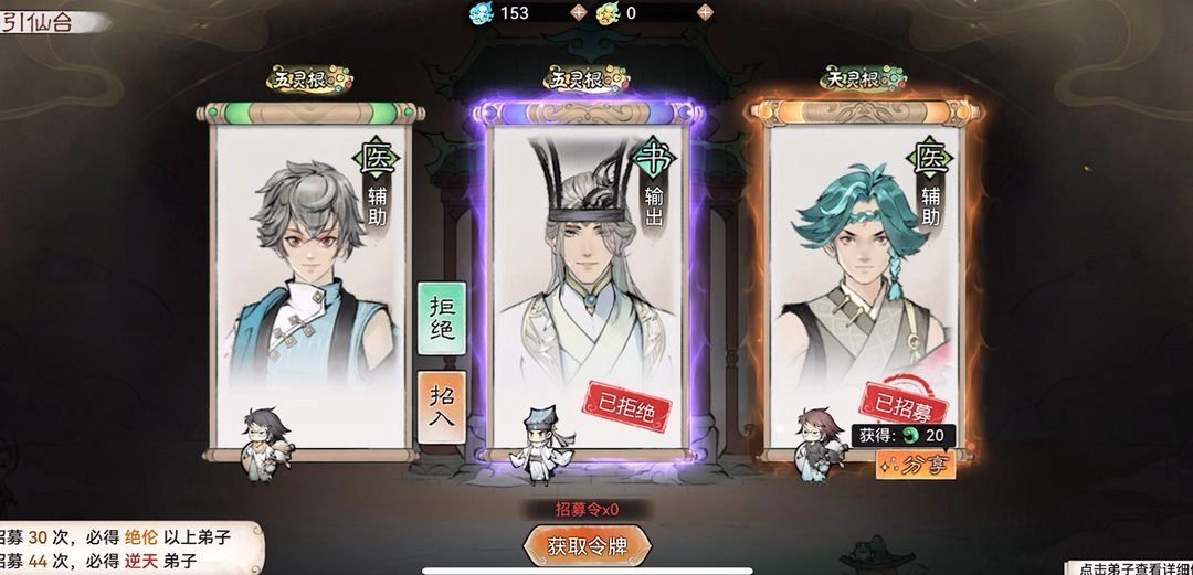 1、招募弟子入门 —— 通过引仙台或家族招募获取弟子,优先选择高灵根(如五灵根)或特殊职业(剑修、兵家、医师),拒绝低质弟子可换仙缘货币。