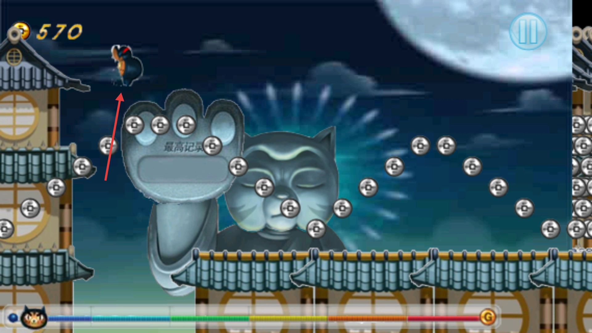 2、点击屏幕让忍者猫跳跃,跳起时再次点击投出【马桶绳索】,悬挂屋顶滑行越过障碍。