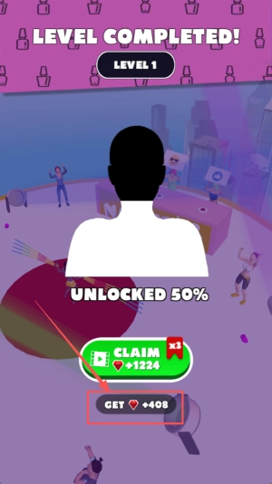 4、领取奖励:当界面弹出A LEVEL COMPLETED时,点击CLAIM领取+408奖励并解锁50%进度。