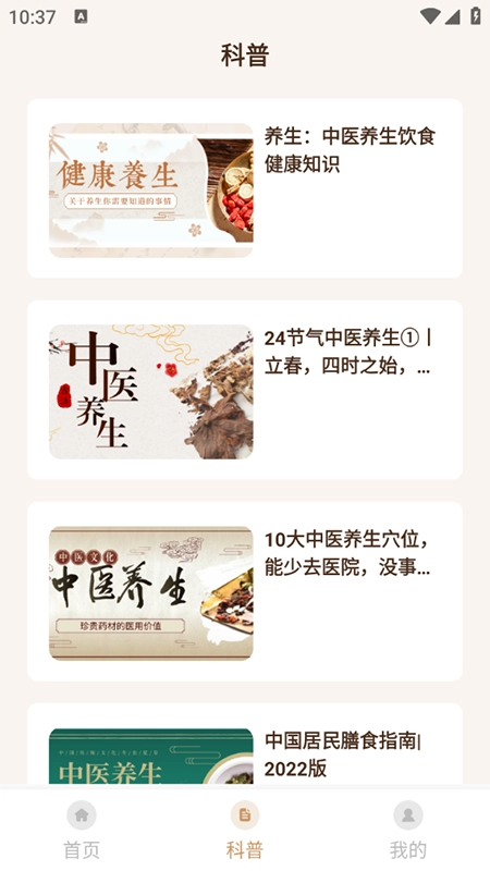 3、养生科普学习可通过进入“科普”页面,按照“季节养生”“体质调理”等分类进行内容浏览,例如点击“夏季养生”即可查看推荐的食材与食谱,同时支持对感兴趣的文章进行收藏。