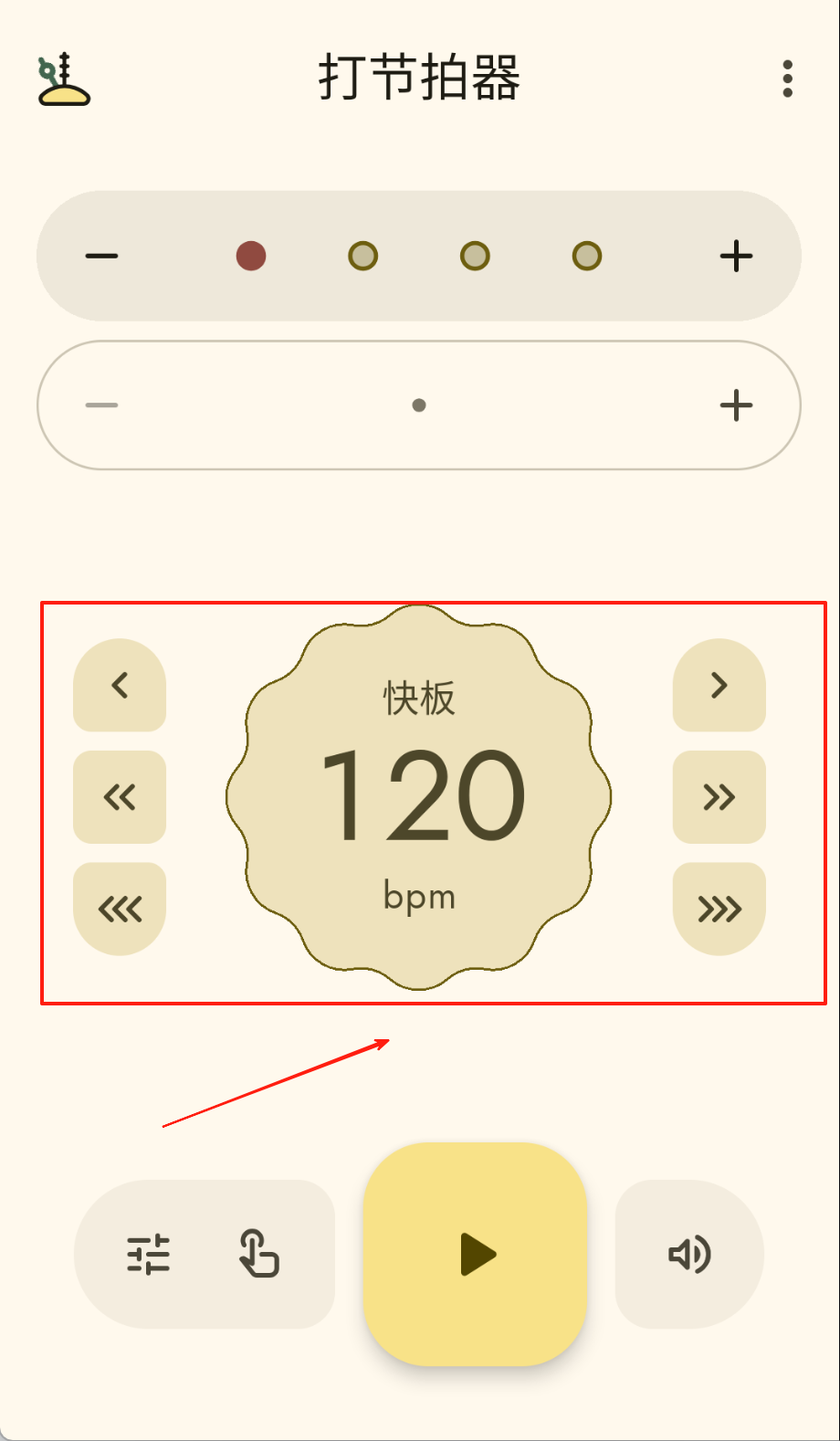 1、通过主界面的旋转拨盘可设定目标BPM数值,点击音色按钮能够切换军鼓、木鱼等不同音效,LED指示灯会实时闪烁以提示节拍点。