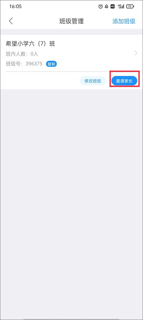 3、进入班级管理页面后,你会看到众多已添加的班级信息,接着点击页面下方的“邀请家长”按钮。