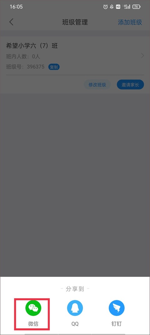 4、页面下方会弹出微信、QQ、钉钉三种分享途径,选择任意一种并发送链接后,家长点击该链接即可进入班级查看自家孩子的学习情况。