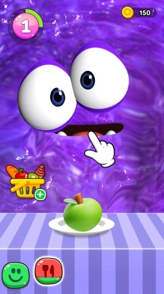 1、点击下方的刀叉,可以将苹果放入口中,进行喂食。