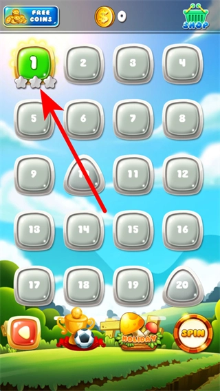 进入游戏后,先选择关卡,然后点击标有数字1的关卡图标,这样就能进入第一关开始游戏了。