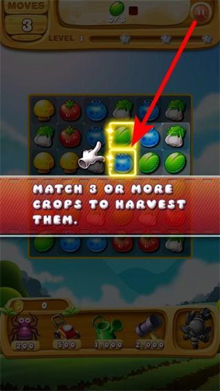 在游戏界面里,点击相邻的农作物来交换它们的位置,要是能让三个或三个以上相同的农作物连成一条直线,就可以消除这些农作物啦。