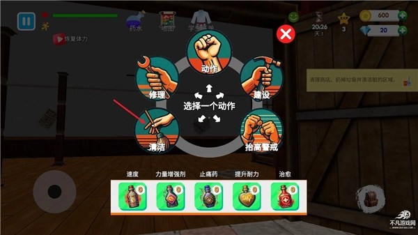 4、接下来要做的是清理我们的武馆,点击右下角的背包,在这里能够切换到清洁等各类操作。
