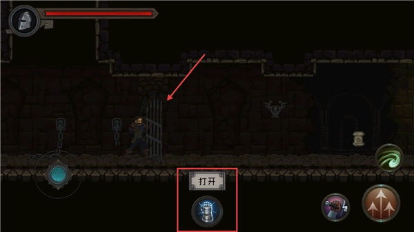 3、遇到封闭铁门时点击【打开】按钮解锁通道,继续深入地牢探索宝藏与任务。